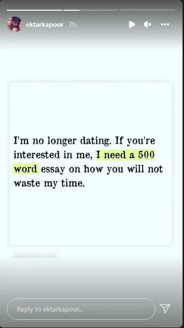 वहीं हाल ही में एकता कपूर ने अपने ब्रैकअप की खबर देते हुए अपने इंस्टाग्राम स्टोरी में पोस्ट कर लिखा- अब मैं डेट नहीं कर रही हूं। अगर आप लोग मुझमें दिलचस्पी रखते हैं, तो मुझे 500 शब्दों का एक निबंध लिखकर दीजिए कि आप कैसे मेरा वक्त बर्बाद नहीं करेंगे।