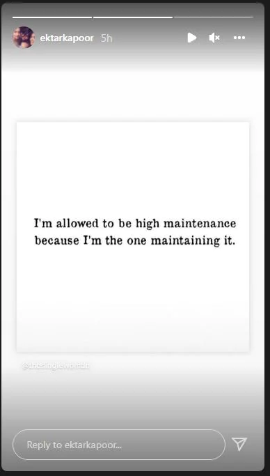 इतना ही नहीं एकता कपूर ने इस दौरान लगातार दूसरा पोस्ट भी किया। इस दौरान अपने दूसरे पोस्ट में एकता कपूर ने लिखा- मुझे हाई मेंटेनेंस में रहना पसंद है, क्योंकि मैं ही तो मेंटेन करने वाली हूं। एकता कपूर के यह दोनों पोस्ट सोशल मीडिया पर काफी वायरल हो रहे हैं और इन्हें लेकर लगातार अलग-अलग प्रतिक्रियाएं भी सामने आ रही है।