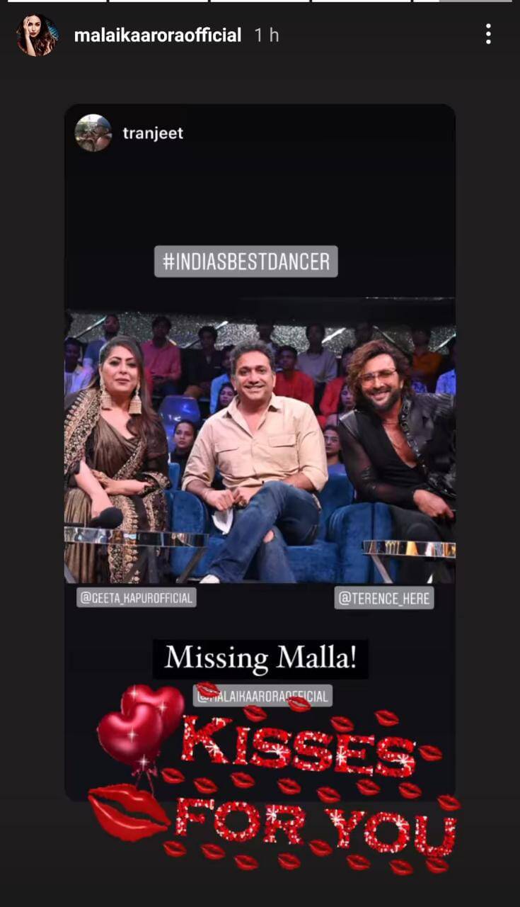 उन्होंने शो की शूटिंग के दौरान एक तस्वीर भी शेयर की, जिसमें वह गीता कपूर Geeta Kapoor और टेरेंस लुईस Terence Lewis के साथ नजर आ रहे हैं। वहीं तस्वीर मलाइका ने इस स्टोरी को अपने इंस्टाग्राम (Malaika Arora Instagram) पर शेयर करते हुए इमोजी के साथ- किस फॉर यू लिखा।