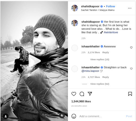 अपनी पत्नी के साथ मजेदार वीडियो को शेयर करते हुए शाहिद कपूर ने कैप्शन में लिखा- उसका पहला प्यार वही है, जिसे वह घूर रही है लेकिन मैं उसका दूसरा प्यार होने के नाते ठीक हूं… क्या करें प्यार तो बस इतना ही होता है. #winterlove