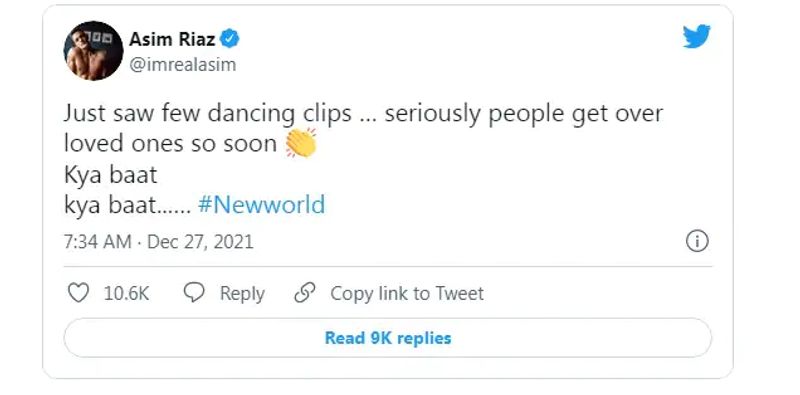 असीम रियाज ने लिखा- लोग जल्दी अपने लोगों को भूल कर आगे बढ़ जाते हैं, क्या बात… क्या बात… नई दुनिया… आसिम रियाज के इस ट्वीट से सिडनाज के फैंस के साथ-साथ टीवी इंडस्ट्री के एक्टर भी नाराज नजर आ रहे हैं। फैन सोशल मीडिया पर SHAME ON ASIM RIAZ और शहनाज की मर्जी हैशटैग यूज कर आसिम को ही ट्रोल कर रहे हैं।